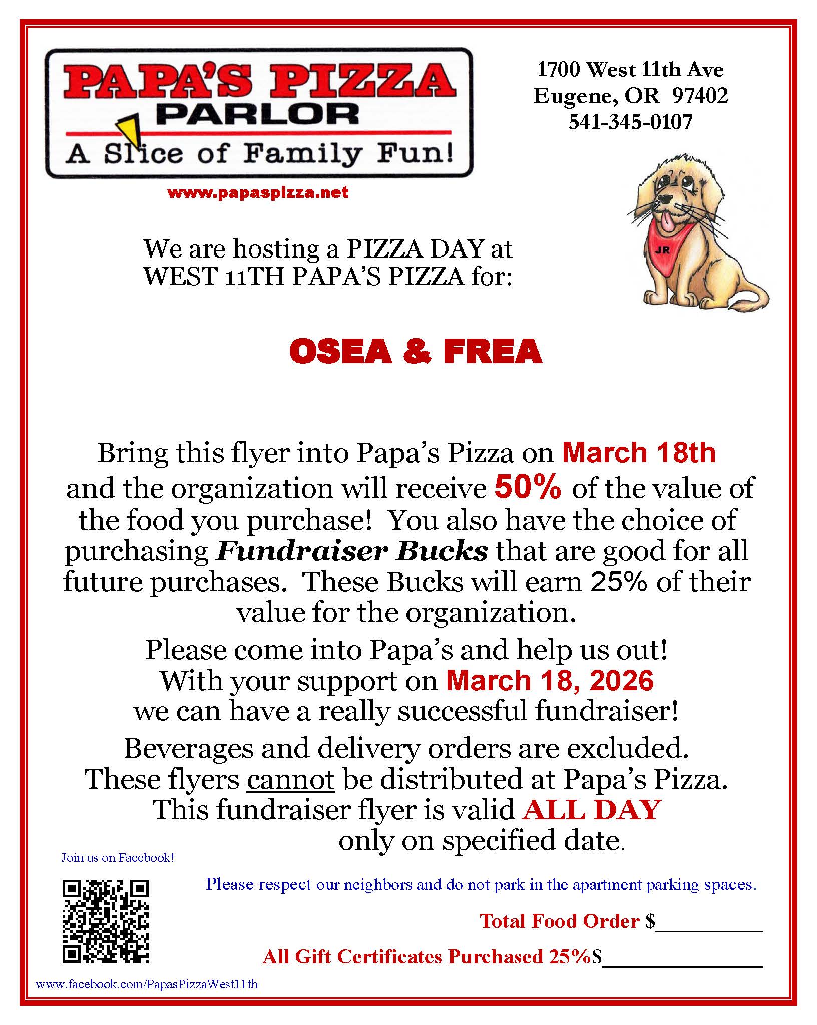 Papa's Pizza Parlor is hosting a Pizza Day at West 11th Papa's Pizza for Fern Ridge's Associations on Wednesday, March 18th (please mark your calendar). Each year, a graduating senior is awarded a scholarship for continuing education in an accredited program of higher learning (trade school, community college, four-year university, etc.) on behalf of FREA and OSEA. Our goal is to raise money to increase the amount of scholarship(s) awarded.